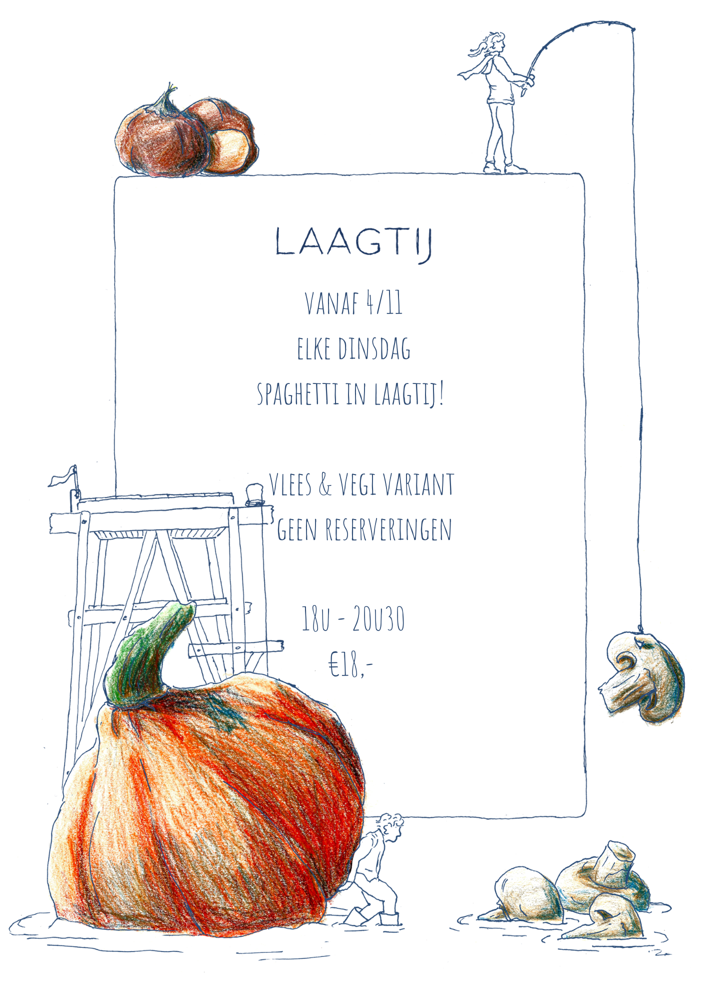 ‘Laagtij’ is een plek van samenhorigheid, een rustplaats op het einde van de week waar dorpelingen en gezinnen uit de streek samenkomen en in een gemoedelijke sfeer het reilen en zeilen van onze gemeenschap bespreken. Socio-culturele en economische thema’s worden niet uit de weg gegaan, alles afhankelijk van de bezetting van de avond. Verhalen worden verteld, geschiedenis herschreven en verbindingen gemaakt. Je kan bij ons aanschuiven voor een nostalgische, eerlijke en gezellige keuken, een hoofdgerecht en een klein dessert.